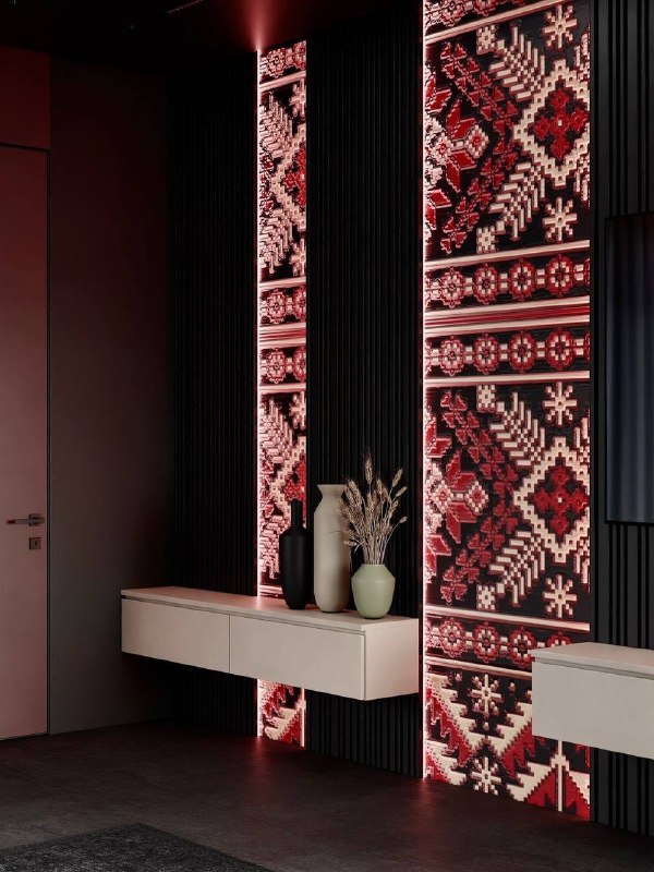 Для стенда WINAL на MosBuild 2026 мы выбрали мезенскую роспись как отдельный визуальный акцент. Это один из самых узнаваемых орнаментов Русского Севера, и нам было важно показать, как такой традиционный мотив может работать на современных панелях WINAL.