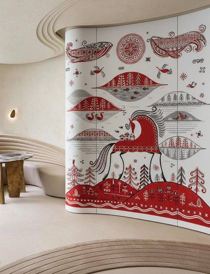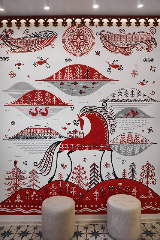 Мезенскую роспись легко узнать по сочетанию красного и черного цветов, четкому ритму символов и графичной пластике. Лошади, птицы, солнечные знаки и геометрические линии делают этот язык выразительным, собранным и удивительно актуальным даже в современном интерьерном контексте.